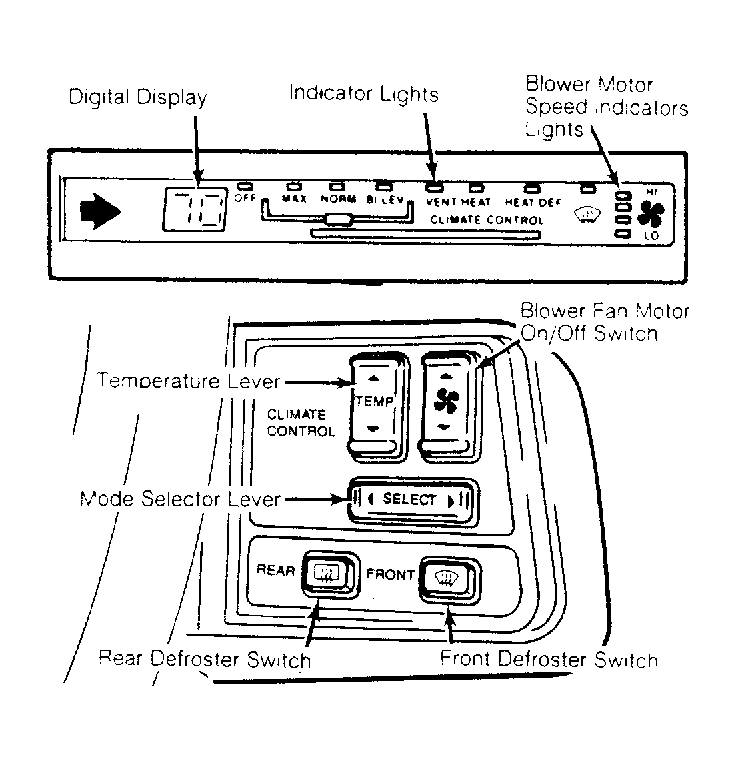 This module consists of 12 bar-type light indicators and a 2 digit temperature light digital display. See Figure. It has 8 mode functions and 4 blower speed settings indicators. This display is located on the instrument panel.