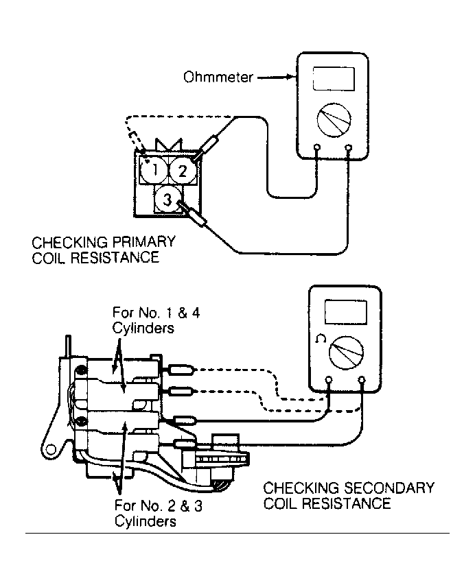 1. Disconnect ignition coil connector. Measure primary coil resistance between ignition coil terminals No. 1 and No. 3. Also measure resistance between ignition coil connector terminals No. 2 and No. 3. See Fig 1 . Primary resistance should be .77-.95 ohms at 68°F (20°C).