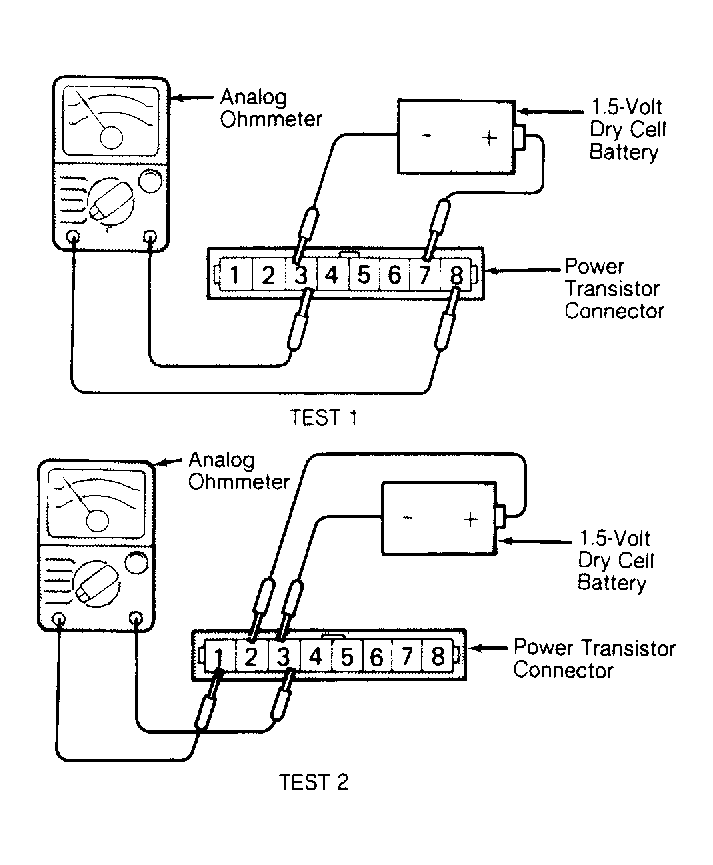 1. To check power transistor for cylinders No. 1 and 4, connect analog ohmmeter leads between power transistor terminals No. 3 and 8. Perform TEST 1. See Fig 1 . Using a 1.5-volt dry cell battery, connect negative lead to terminal No. 3.