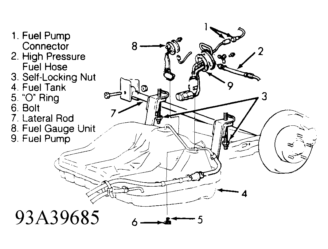 2. Lower fuel tank by loosening tank strap self-locking nuts to end of stud bolt. DO NOT remove self-locking nuts completely. See Figure . Remove lateral rod bolt. Disconnect lateral rod from body bracket. Remove bolt and "O" ring from bottom of fuel tank. Remove fuel pump bolts and remove fuel pump.