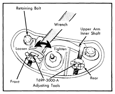 - Install alignment tools (T69P-3000-A) into frame holes and tighten tools finger tight against upper arm inner shaft. Then, using a wrench, tighten an additional turn. Loosen bolts attaching upper arm inner shaft to frame. Firmly tap bolt heads to loosen lower assemblies. See Fig 1.