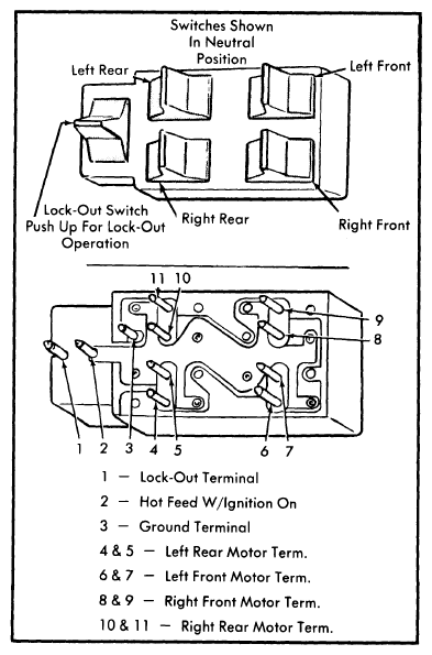 - Push any one of all four switches rearward and hold in that position. All even numbered pins of the switch pushed rearward should have continuity with pin two. If any one switch does not test correctly, as previously outlined, switch must be replaced.