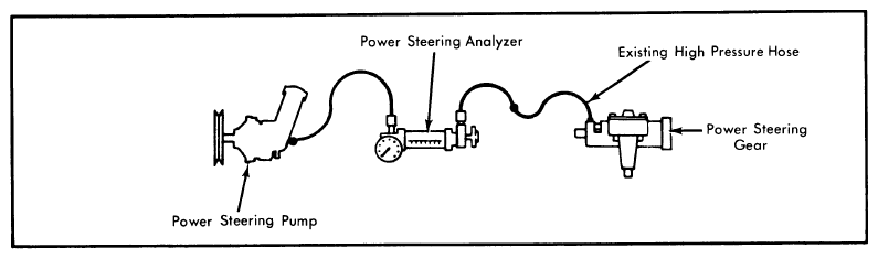 Pump flow and pressure tests are accomplished using a suitable flow/pressure analyzer (970-001) to determine system back pressure, pump flow, and internal leakage in the steering gear, control valve and cylinder. Prior to making these tests, assure that tire pressure, belt tension and fluid levels are proper. Check entire system for damage and note pulley size and pump model for proper vehicle application. Model identification labels are attached to the reservoir body with adhesive. HBC (Ford/TRW) pumps will have a suffix giving pump model, while HBA pumps (Saginaw) will only indicate the letters GS, GR, or GT on the tag. Reservoir must be kept full and at normal operating temperature (165-175° F) during testing. Using Figure through Figure, attach tester and proceed as follows: