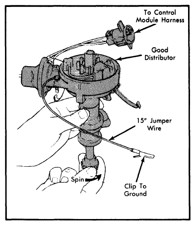 - Refer to step 1) of Coil Primary Circuit Check. If modified plug sparked, but engine would not run, substitute a known good distributor (ground but do not install). Spin gear and check for sparks. See Fig 1.