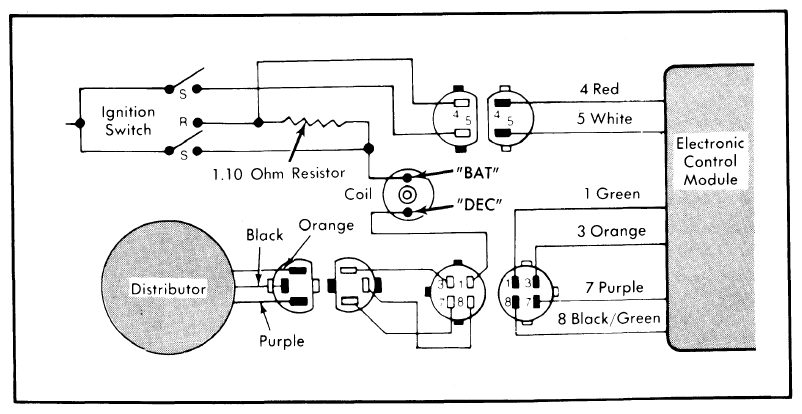 Each Dura-Spark II module has 6 wires (a 2-wire connector and a 4-wire connector). See Fig 1. The red and white wires are the ignition feed wires - the white for cranking, the red after the engine begins to run. The red wire circuit contains a 1.1 ohm wire resistor. The current in the primary circuit of the ignition coil is turned off and on by the green wire. The orange and purple wires transmit signals to the module from the armature and pick-up coil in the distributor. The black wire is used to ground the distributor. The module is "ON" whenever the ignition switch is in the "RUN" or "START" position.