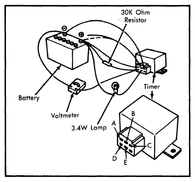 2. Connect positive test lead of a voltmeter to terminal "D" and negative test lead to battery negative terminal. Connect jumper wires from timer terminals "A", "D" and "E" to battery positive terminal. DO NOT connect wire from terminal "B" at this time.