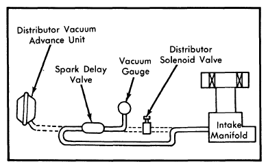 - Disconnect vacuum tube from vacuum delay valve at distributor solenoid valve. Connect a vacuum gauge to vacuum tube. See Fig 1.