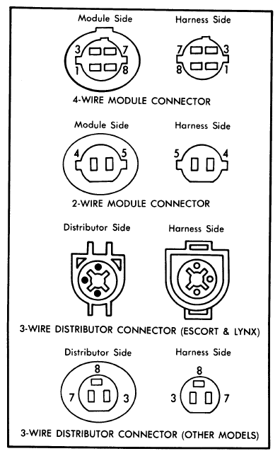 Each Dura-Spark II module has 6 wires. (A 2-wire and 4-wire connector). See Fig 1. Modules with dual mode timing have 9 wires. The red and white wires are the ignition feed wires - the white circuit is for cranking, the red circuit for operation after the engine begins to run. The red wire circuit contains a 1.1 ohm wire resistor. The current to the primary circuit of the ignition coil is turned off and on through the green wire. The orange and purple wires transmit signals to the module from the armature and stator in the distributor. The black wire is used to ground the distributor. The module is "ON" whenever the ignition switch is in the "ON" or "START" position.