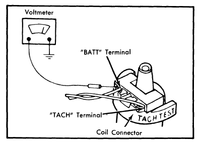 3. Readings in both instances should be 90 percent of battery voltage while cranking. If so, proceed to "Distributor Stator Assembly Check ". If less than 90 percent, proceed to "Wiring Harness Shorts Check ". Also check ballast resistor by-pass circuit, replace damaged wiring harnesses, and check for worn or damaged ignition switch.