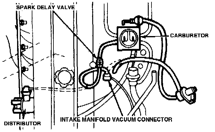 2. Disconnect vacuum sensing tube from spark delay valve at distributor vacuum advance unit and connect tube to intake manifold.