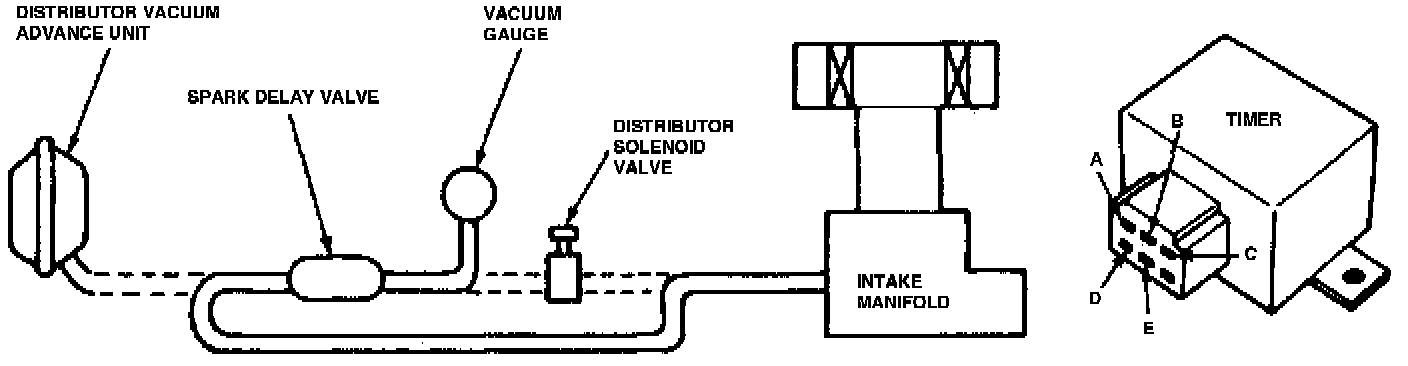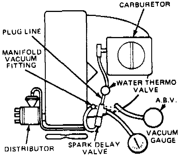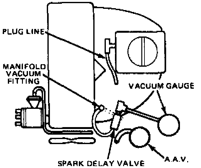 1. Disconnect vacuum sensing tube from spark delay valve at distributor solenoid and connect a vacuum gauge to tube.
