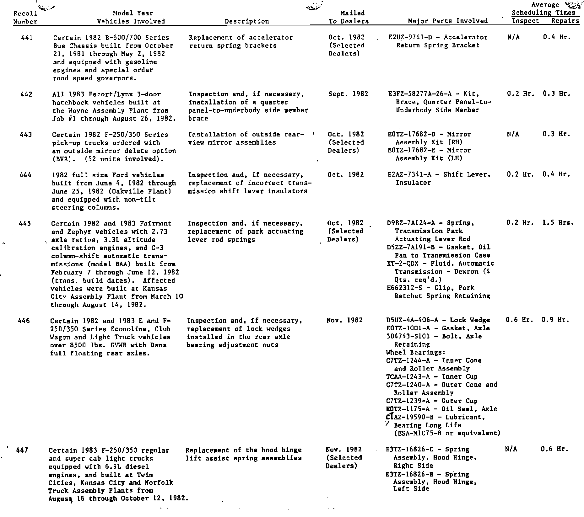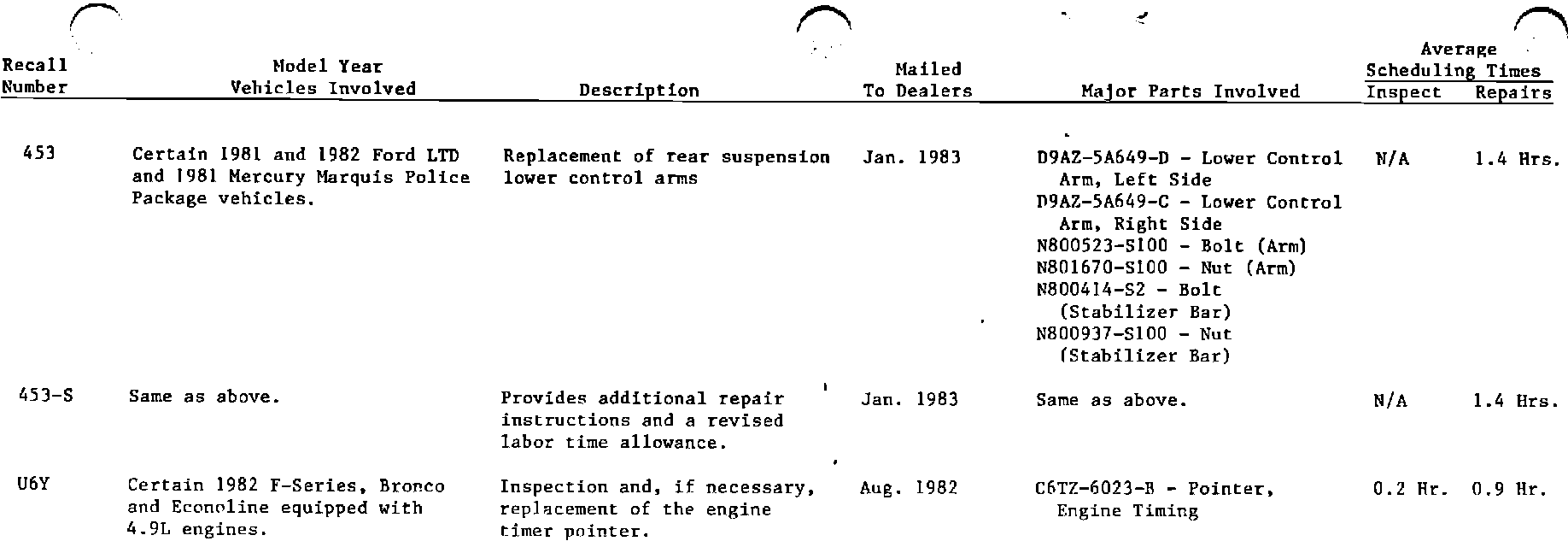 Attached is a listing of recalls launched from July 1982 to date. It is organized to provide quick access to important information about each recall such as the units involved, major parts required, and appropriate times that you may wish to use for scheduling of repairs.