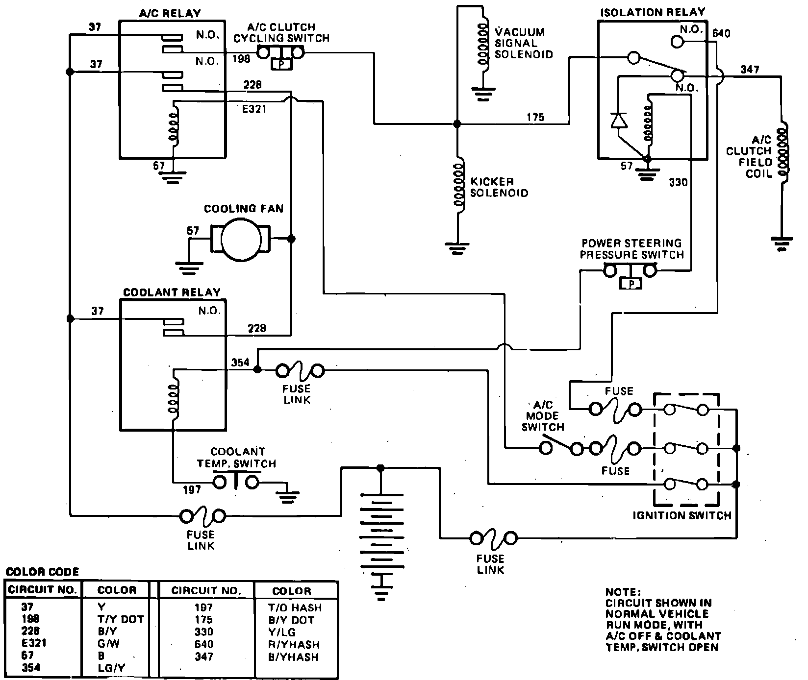 7. Using an ohmmeter, check continuity of wire 228 from relay connector to coolant temperature switch connector. If no continuity exists, repair wires and/or connectors. If continuity exists, replace cooling fan relay and recheck step 2.