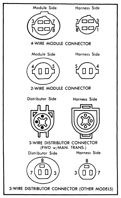 Each Dura-Spark II module has 6 wires (a 2-wire and a 4-wire connector). See Figureand Figure. Modules with dual mode timing have an additional 3-wires leading to one 3-wire connector. The Red and White wires are the ignition feed wires (the White wire is for cranking and Red wire is for operation after the engine is running). The Red wire circuit contains a 1.1 ohm resistance wire. The current to the primary circuit of the ignition coil is turned off and on through the Green wire. The Orange and Purple wires transmit signals to the electronic control module from the reluctor (armature) and pick-up coil (stator) in the distributor. The Black wire is used to ground the electronic control module through the distributor housing. On models with dual mode timing, the additional 3 wires connect to either a vacuum modulator valve or a barometric pressure switch.