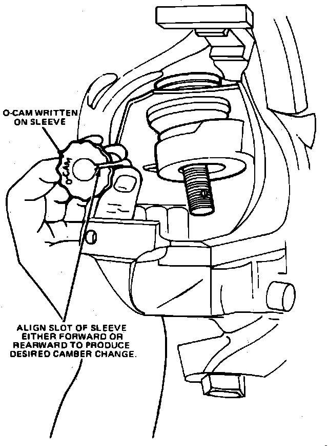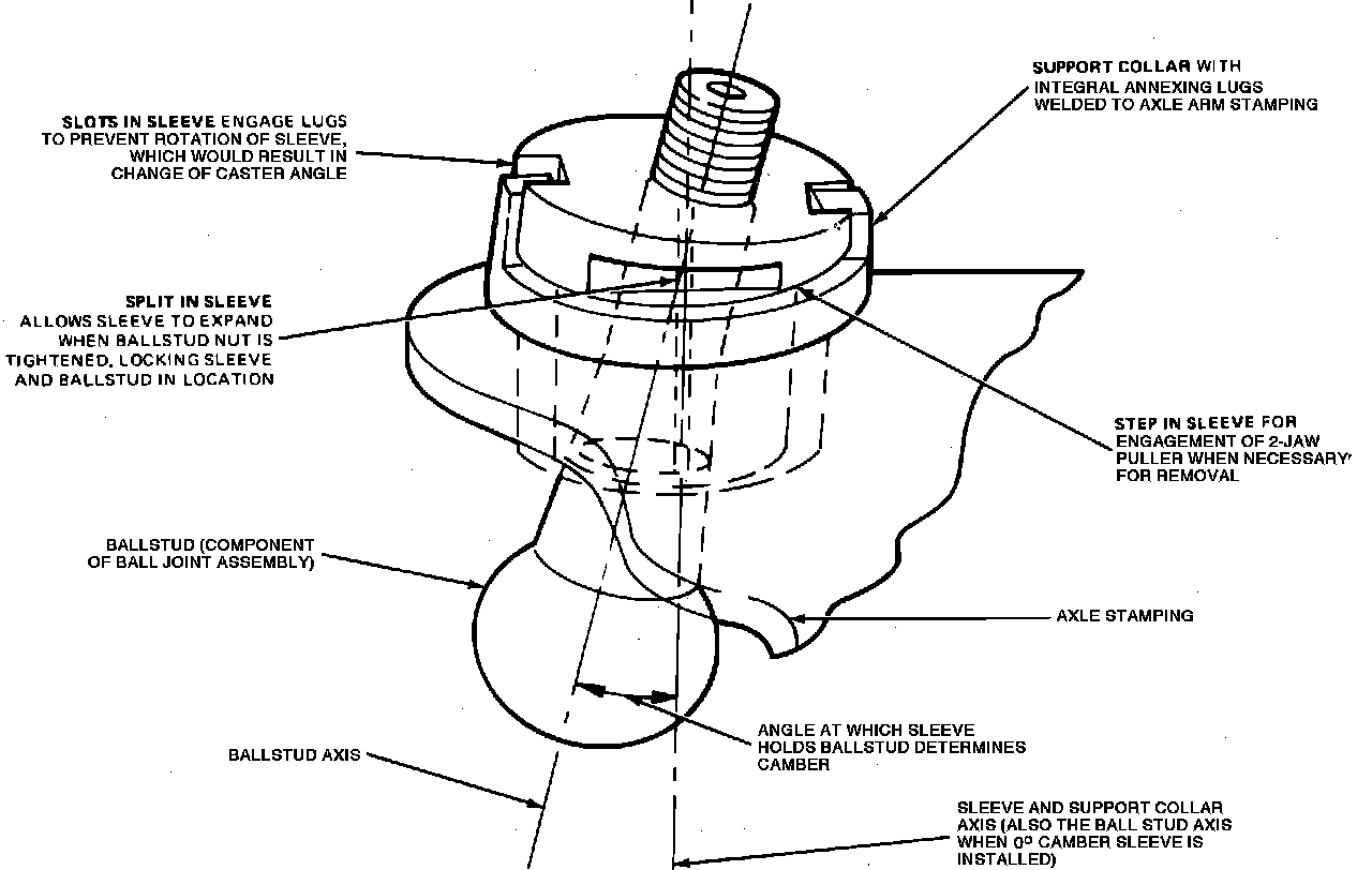 The camber angle may be adjusted by means of mounting sleeves placed on the upper ball joint, Figs. 9, 10 and 11. Four sleeves are available in {1/2}° camber increments to allow a 3° range of adjustment from - 1 {1/2}° to +1 {1/2}°.