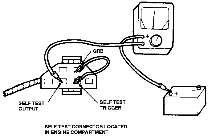 3. Connect voltmeter from battery positive terminal to self-test output on self-test connector, Fig. 3. Set voltmeter to DC volt range from 0-15 volts.