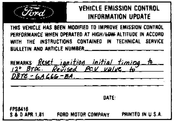 The customer should retain the removed PCV valve. If the vehicle is returned to continuous sea level operation: retard timing from 12 ° to 10 ° BTDC; replace the EV49 PCV valve with the EV-118 PCV Valve (the altitude compensating diaphragm added to the automatic transmission need not be replaced) and; remove the Vehicle Emission Control Information Up- date Label.
