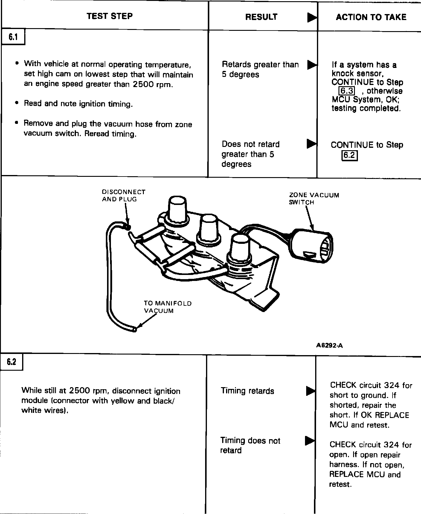 In 6.2, "Timing retards" if a short-to-ground is detected the short should be serviced and the MCU retested. If the short-to-ground is not present, replace the MCU and test. In 6.2, "Timing does not retard" if an open is detected, the open should be serviced and the MCU retested. If the open is not present replace the MCU and retest. A copy of the revised page is attached so it can be placed in your manual.