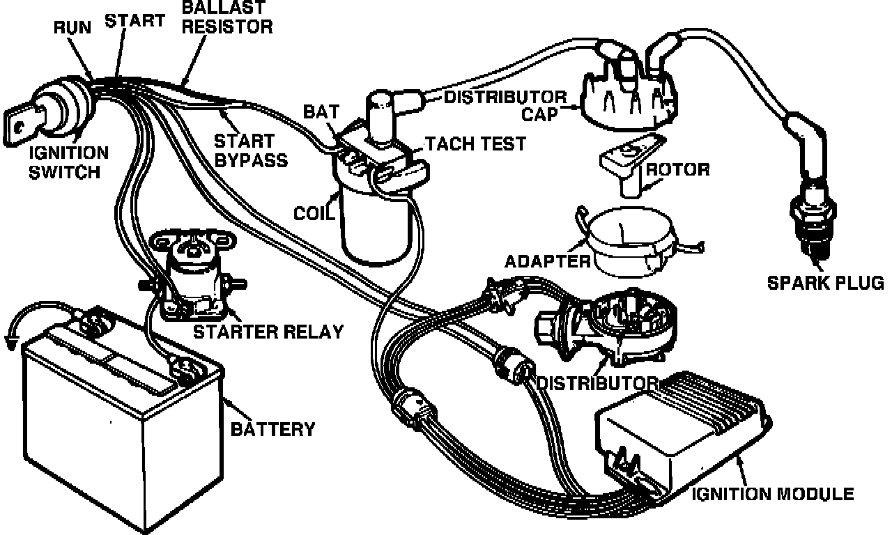 The system uses a distributor cap and adapter, rotor and ignition wires. The higher spark plug voltage in this system is obtained by reducing the value of the ballast resistor in the primary side of the ignition system.