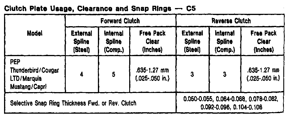 C-5 3-spd A/T, Clutch Plate Usage/Clearance: