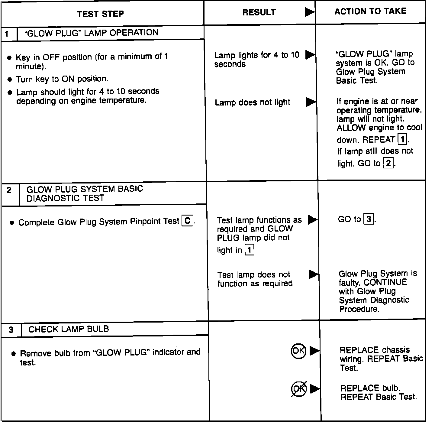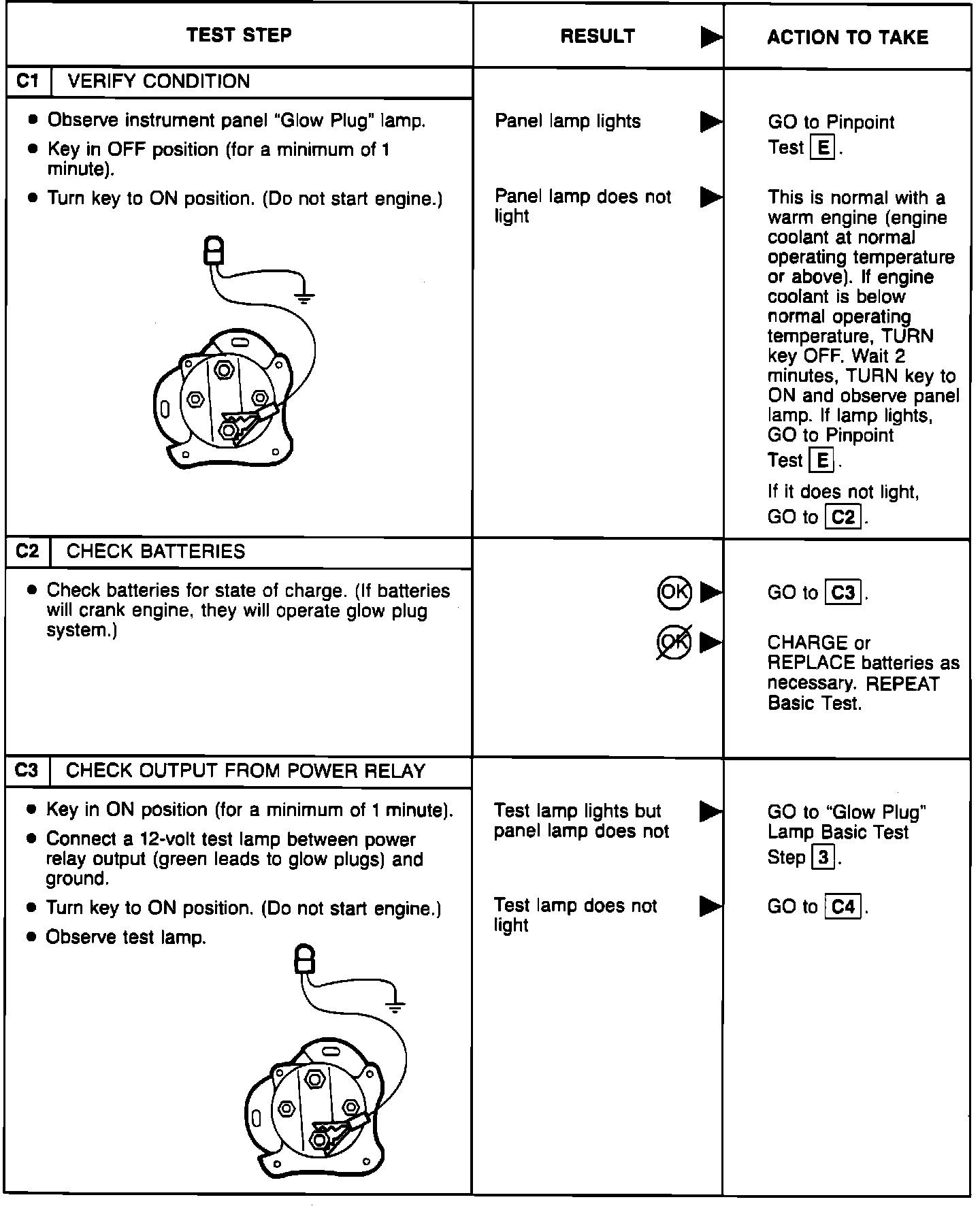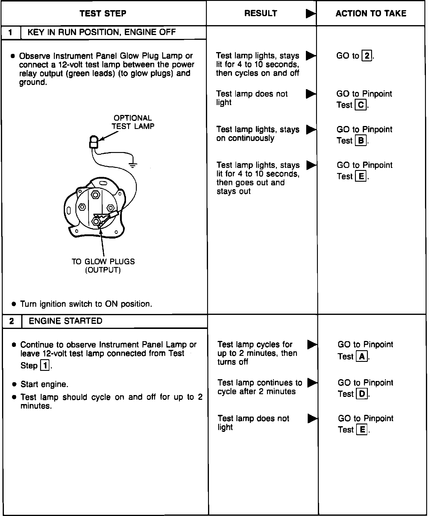 Perform the glow plug system diagnostic test (referred as Basic test) first. If the vehicle passes the Basic test without running any Pinpoint tests, you will know the glow plug system is functioning properly. The vehicle's problem exists somewhere else other than the glow plug system. If a step of the Basic test fails, run only the Pinpoint test specified by the failed step. Refer to glow plug diagnostic test point chart for test lamp connections and glow plug system wiring harness test points. Perform only those services specified by the Pinpoint tests. Operation of the glow plug system is completely automatic. If after completing a specific Pinpoint test it is determined that a component must be replaced, the glow plugs should be disconnected until the system has been rechecked by repeating the Basic test to make sure the glow plug system works properly.