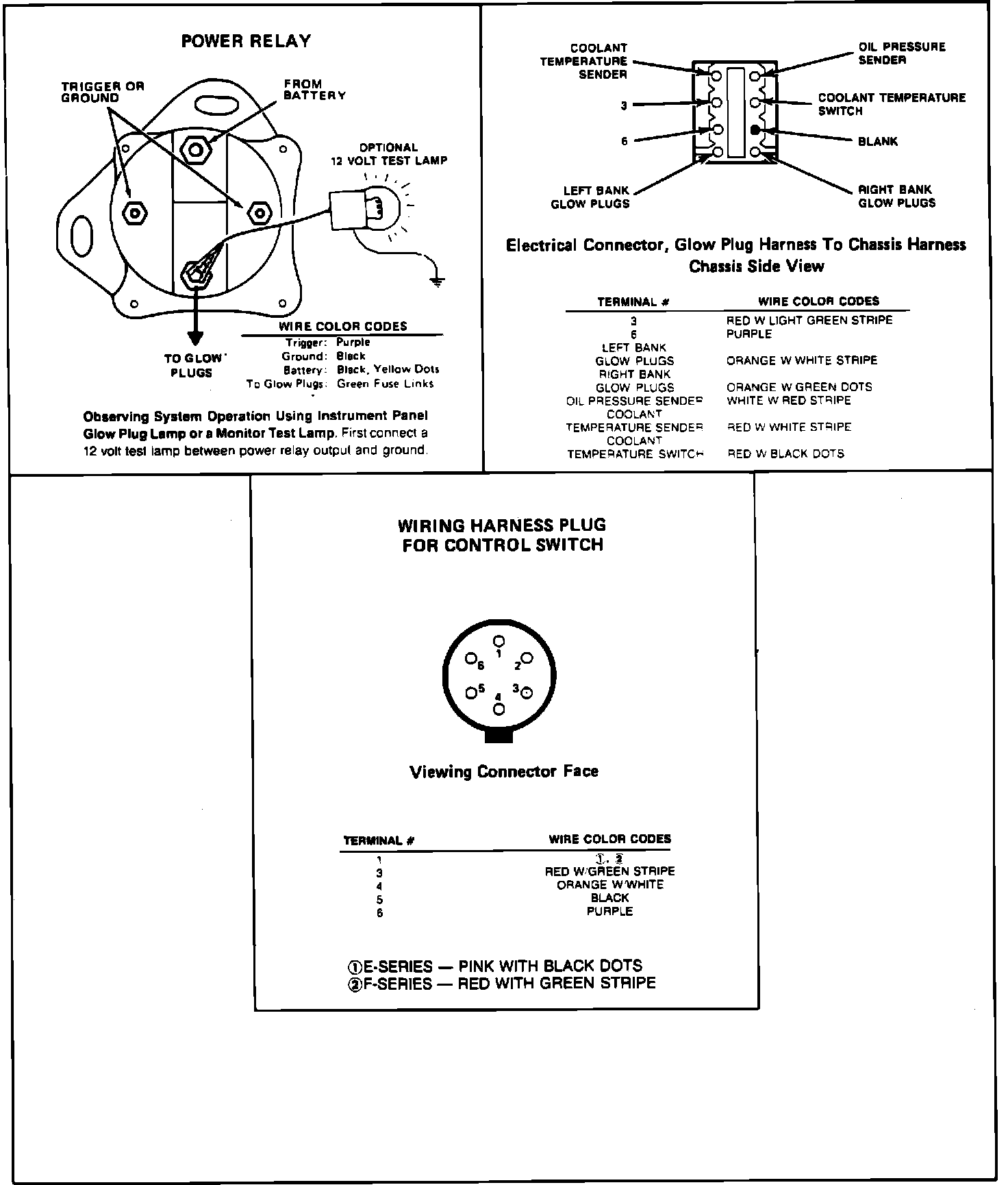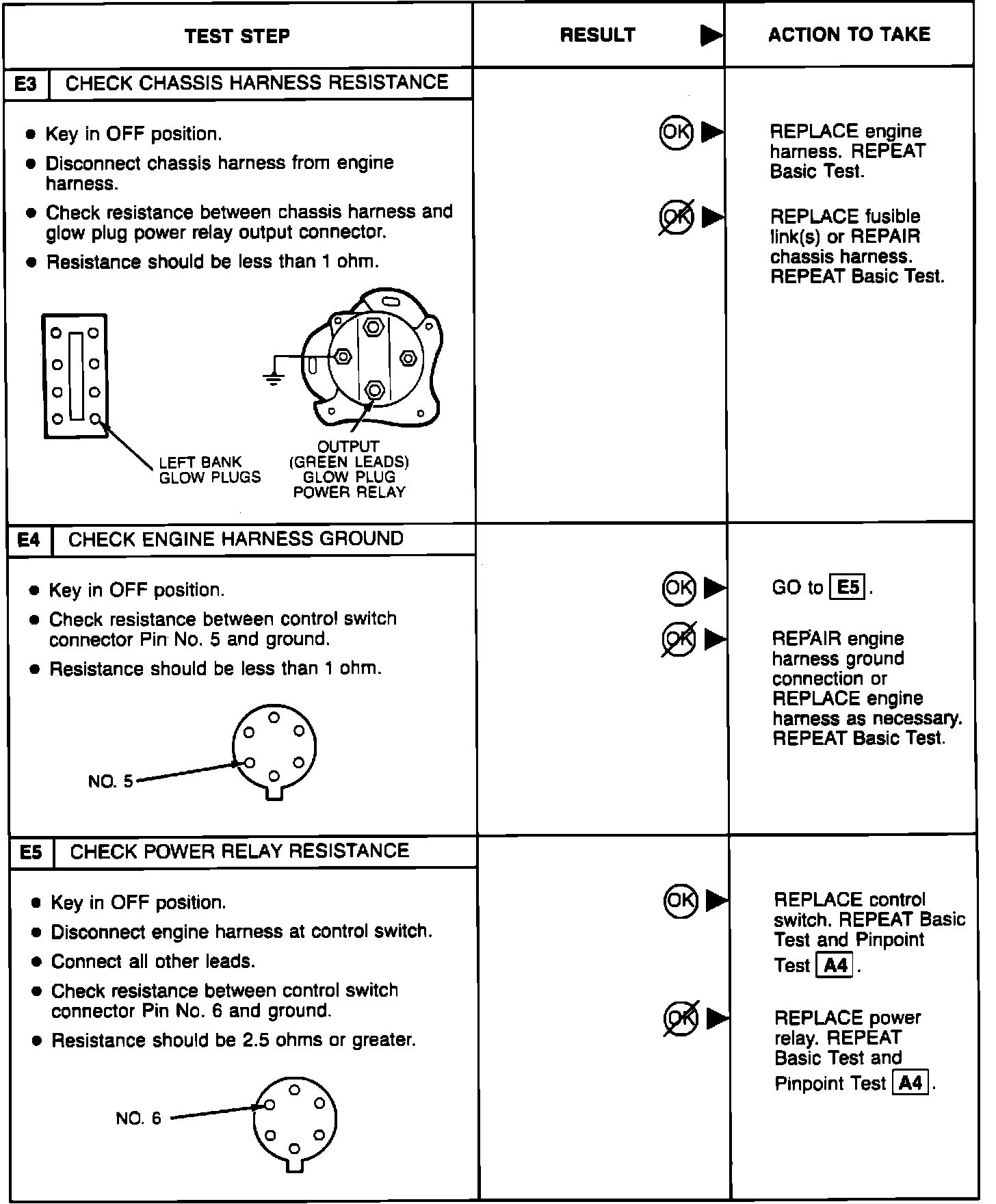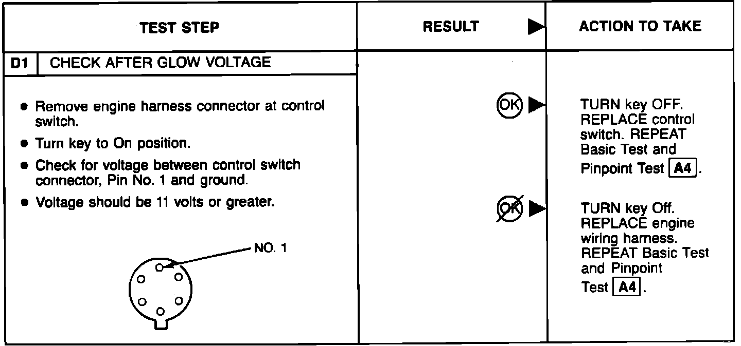 Perform the glow plug system diagnostic test (referred as Basic test) first. If the vehicle passes the Basic test without running any Pinpoint tests, you will know the glow plug system is functioning properly. The vehicle's problem exists somewhere else other than the glow plug system. If a step of the Basic test fails, run only the Pinpoint test specified by the failed step. Refer to glow plug diagnostic test point chart for test lamp connections and glow plug system wiring harness test points. Perform only those services specified by the Pinpoint tests. Operation of the glow plug system is completely automatic. If after completing a specific Pinpoint test it is determined that a component must be replaced, the glow plugs should be disconnected until the system has been rechecked by repeating the Basic test to make sure the glow plug system works properly.