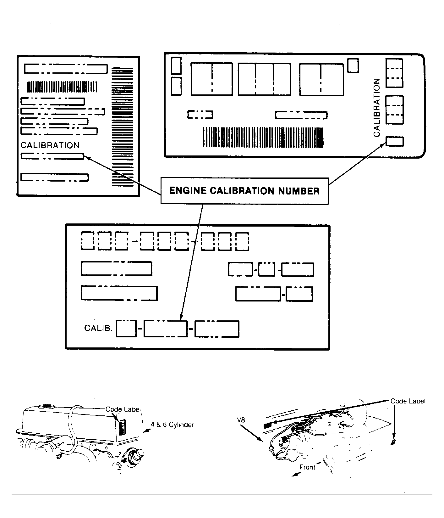 Located on the front of the engine, there is an Engine Code information label containing the engine calibration. The label may be any of several different styles. See Fig 1. Using the calibration number and the Vacuum Diagram Index, determine which vacuum diagram to use for the vehicle being serviced.