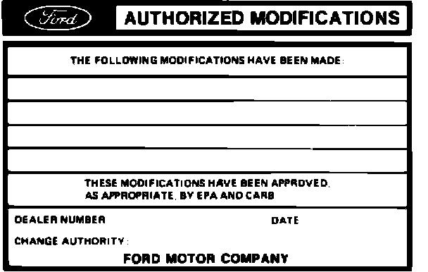 Obtain an Authorized Modifications decal and list the date, dealer number and summary of alterations performed. Select a prominent place adjacent to the Vehicle Emission Control Information decal suitable for installing the Authorized Modifications decal. Clean the area, install the decal and cover it with a clear plastic decal shield.