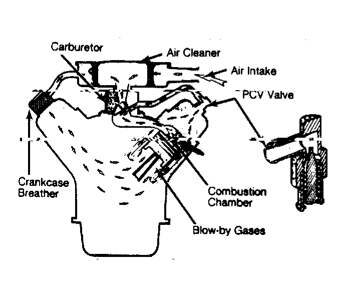 The entering fresh air then combines with blow-by gases and unburned air/fuel mixture present in the crankcase. The combined gases are then drawn into the carburetor, through the PCV valve, by manifold vacuum. The combined gases mix with the air/fuel mixture and are burned in the combustion chamber. See Fig 1 .