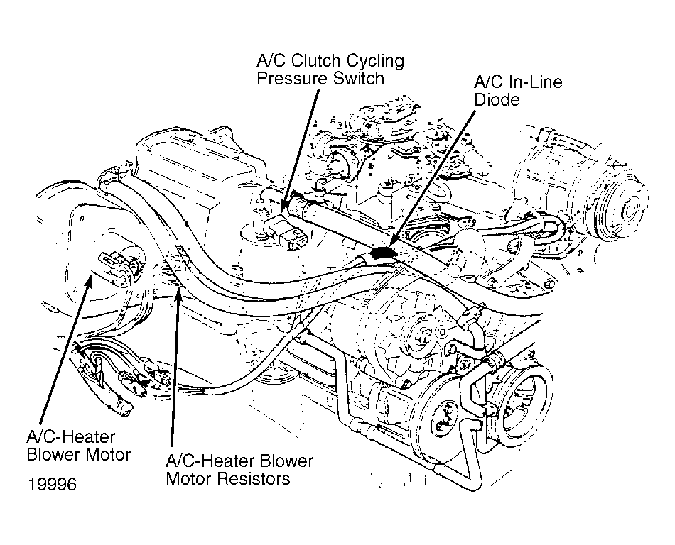 A/C In-Line Diode In engine wiring harness, behind alternator. See Figure.