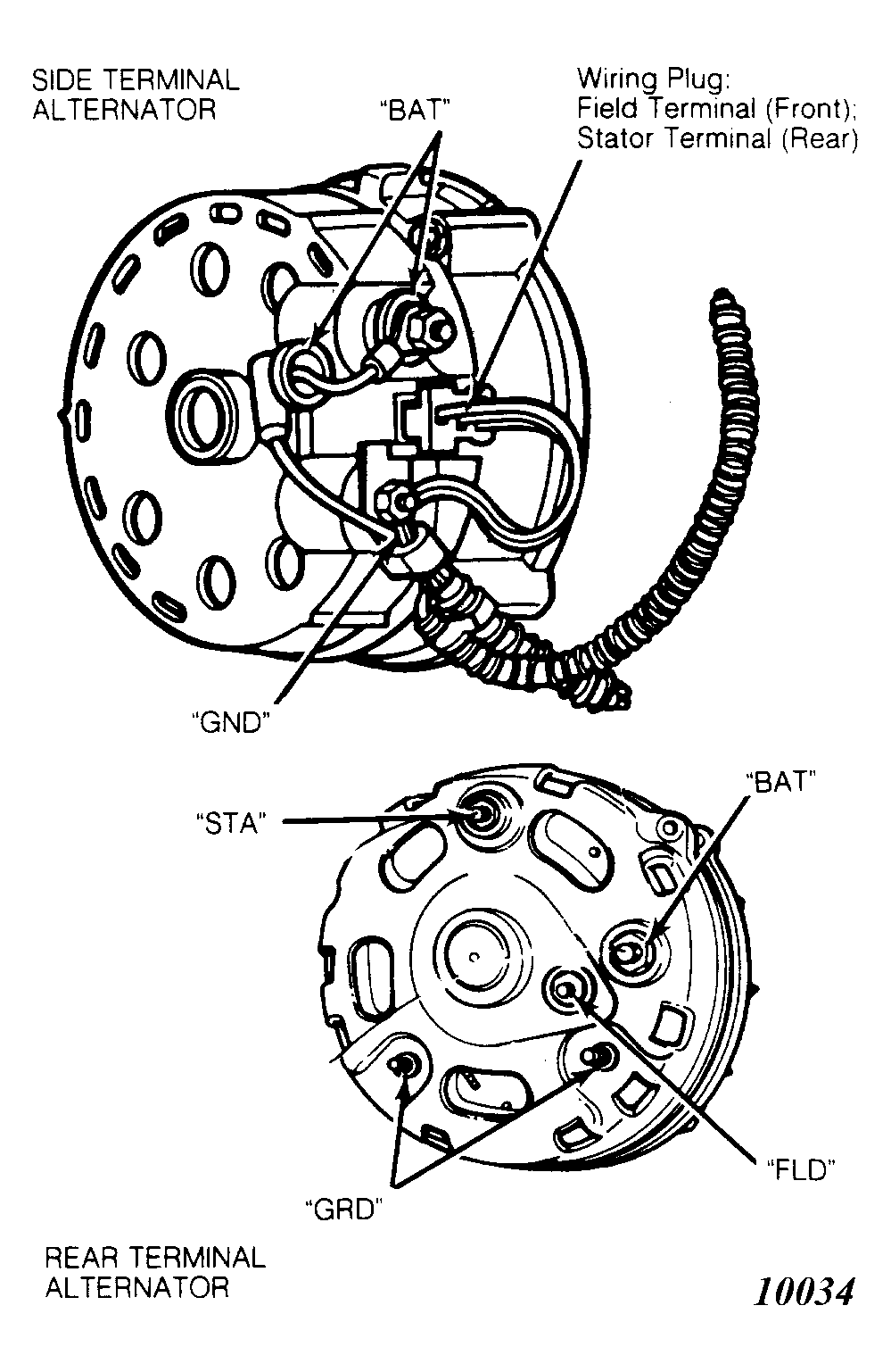 Ford light trucks use 2 similar alternators, a rear terminal model and a side terminal model. See Figure and Figure . Rated outputs range from 40 to 100 amps. depending upon model used. Some models are equipped with indicator lights, others with ammeters.