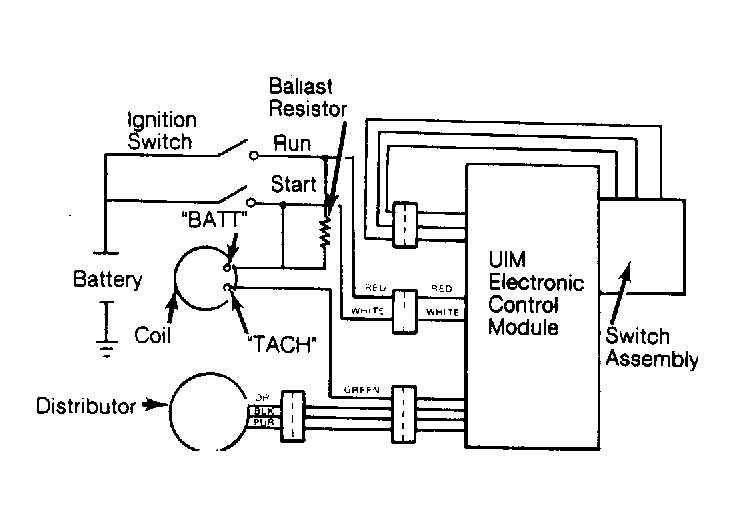 The Dura-Spark II systems contain a distributor, electronic control module and ignition coil and function much the same as other solid state systems. See Figure and Figure . An armature on the distributor shaft rotates past a stators (pick-up coil).