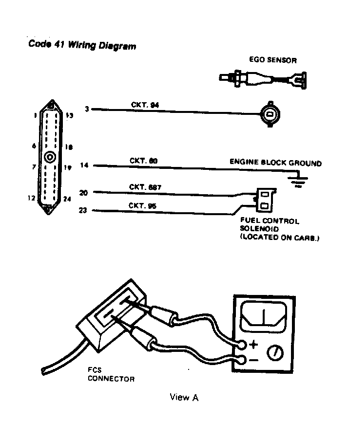 - Turn ignition off. Connect negative lead of voltmeter to back of solenoid harness connector (circuit 95) and positive lead to battery positive terminal. See View C in Fig 2 . Start engine and idle at 2500 RPM. Observe voltmeter after 55 seconds. If voltage is 10 volts or less, replace MCU and retest. If voltage is greater than 10 volts, go to next step.