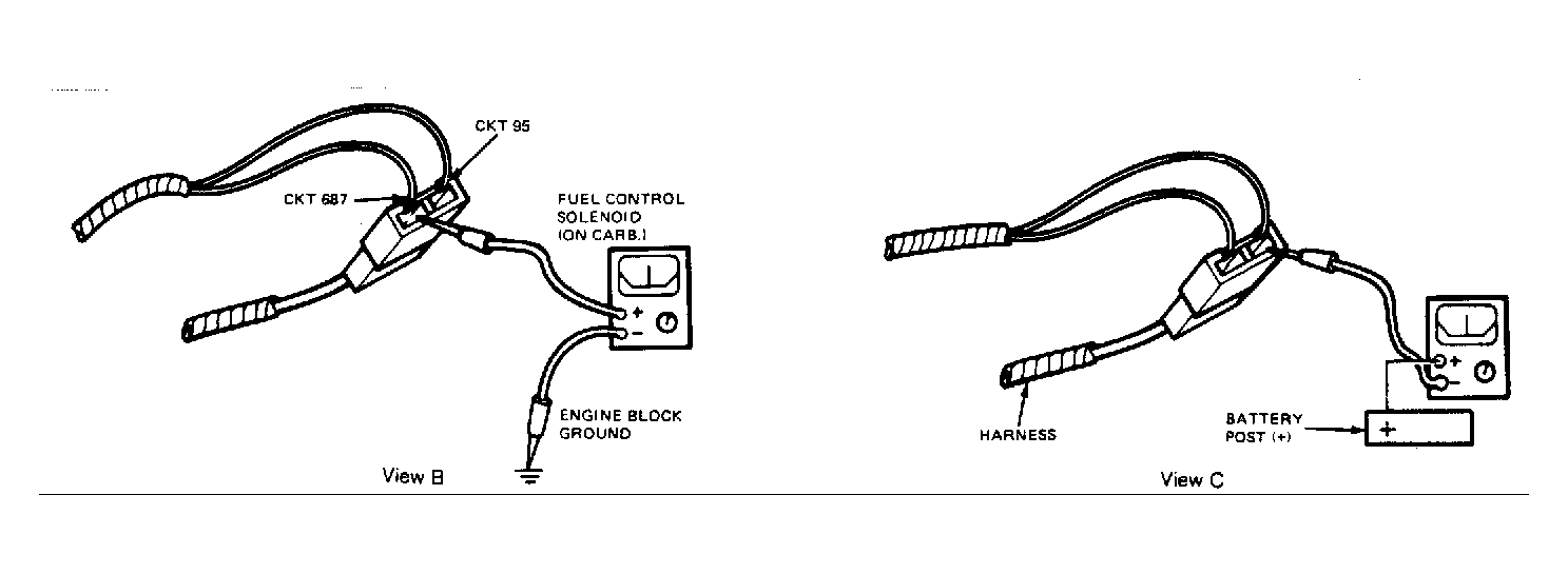 - Reconnect FCS. Turn key on, but do not start engine. Connect positive lead of voltmeter to back of solenoid harness connector (circuit 687) and negative lead to ground. See View B in Fig 2 . Start engine and idle at 2500 RPM. After 55 seconds, observe voltmeter. If voltage is more than 10 volts, go to next step. If voltage is 10 volts or less, repair open circuit and retest.