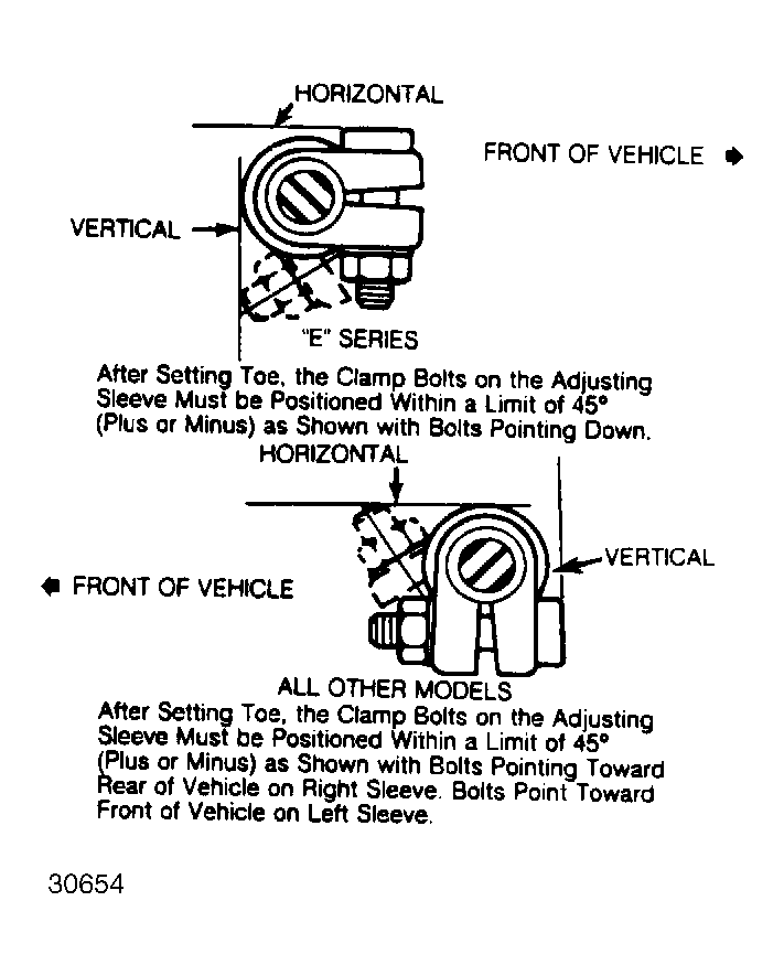 - Loosen adjusting sleeve clamp bolts on each end of tie rod (left side only on "E" series). Rotate sleeve(s) until correct toe alignment is obtained.