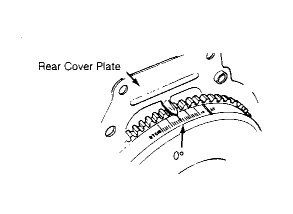 - Rotate crankshaft pulley slowly, counterclockwise, until dial indicator pointer stops moving. This will be approximately 30-50° BTDC.