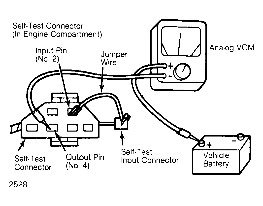 - This is a static check of processor input and output circuits. Connect STAR tester or VOM to vehicle Self-Test connector. See Fig 1 for correct VOM connections. Turn ignition switch to ON position to start Self-Test. DO NOT depress throttle during test. Observe and record all On Demand and Continuous/Memory service codes.