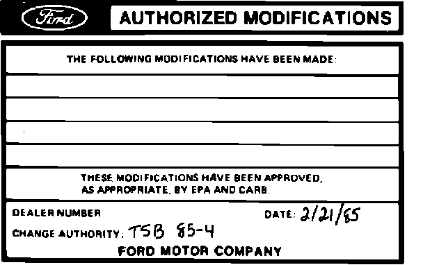 Obtain an Authorized Modifications decal and list the date, dealer number and summary of alterations performed. Select a prominent place adjacent to the Vehicle Emission Control Information decal suitable for the Authorized Modifications decal. Clean the area, install the decal and cover it with a clear plastic decal shield.
