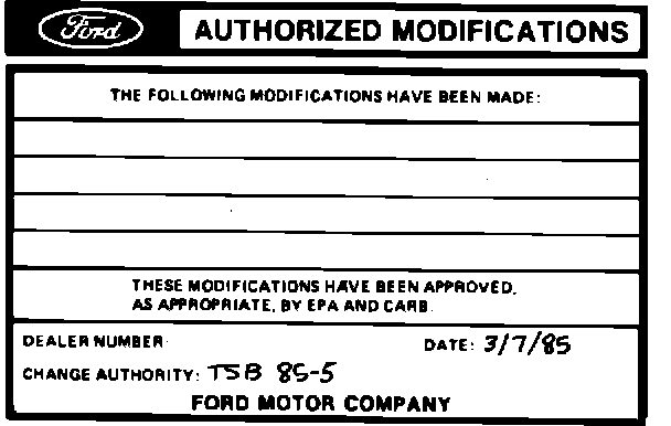 Obtain an Authorized Modifications decal and list the date, dealer number and summary of alterations performed. Select a prominent place adjacent to the Vehicle Emission Control Information decal suitable for installing the Authorized Modifications decal. Clean the area, install the decal and cover it with a clear plastic decal shield.
