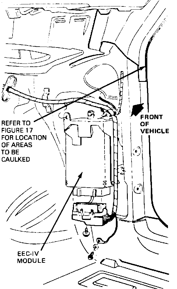 Water may leak through a sealer skip between the cowl side and upper cowl assembly. Leaking water falls onto EEC IV module resulting in no start condition. Service by sealing the cowl side. Replace the EEC processor.