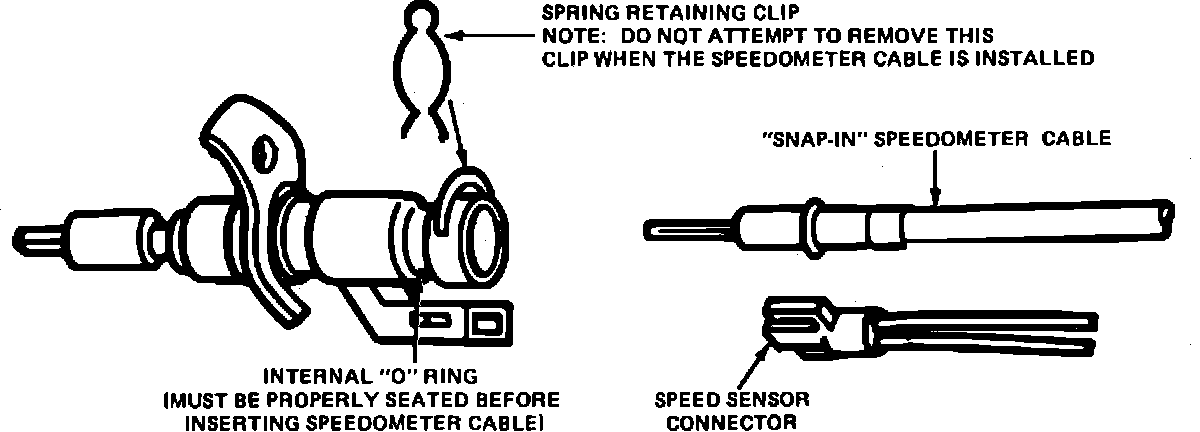 3. Disconnect electrical connectors from speed sensor, then speedometer cable by pulling it out of the speed sensor. Do not remove spring retainer clip with speedometer cable in the sensor.