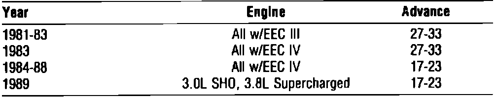 Home >> Ford >> 1985 >> Mustang V6-232 3.8L >> Repair and Diagnosis >> Powertrain Management >> Ignition System >> Ignition Timing >> Specifications >> Computer Timing Advance