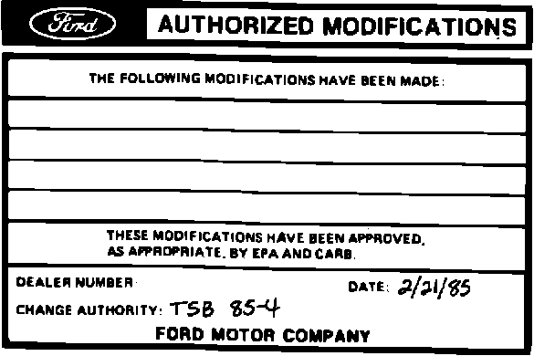 Obtain an Authorized Modifications decal and list the date, dealer number and summary of alterations performed. Select a prominent place adjacent to the Vehicle Emission Control Information decal suitable for installing the Authorized Modifications decal. Clean the area, install the decal and cover it with a clear plastic decal shield.
