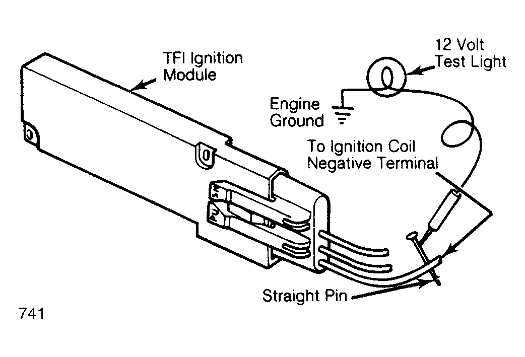 - Insert a small straight pin in wire to ignition coil negative terminal about 1" from ignition module connector. Attach test light between straight pin and engine ground.