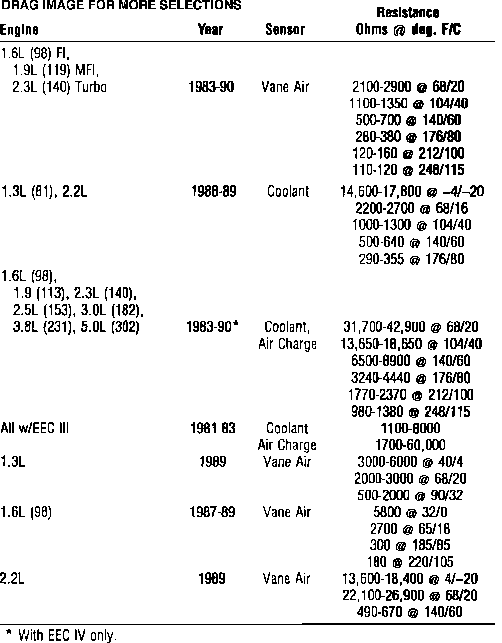 Home >> Ford >> 1986 >> Midsize LTD V6-232 3.8L >> Repair and Diagnosis >> Specifications >> Electrical Specifications >> Coolant Temperature Sensor/Switch (For Computer)