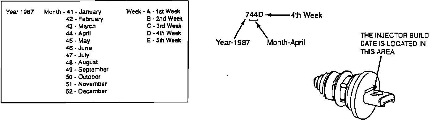 6. Refer to Figure 1, below. Look at the side of the injector electrical connector for the build date. (Three numbers followed by one letter). Using the following chart, interpret the injector build date 744D as per example.