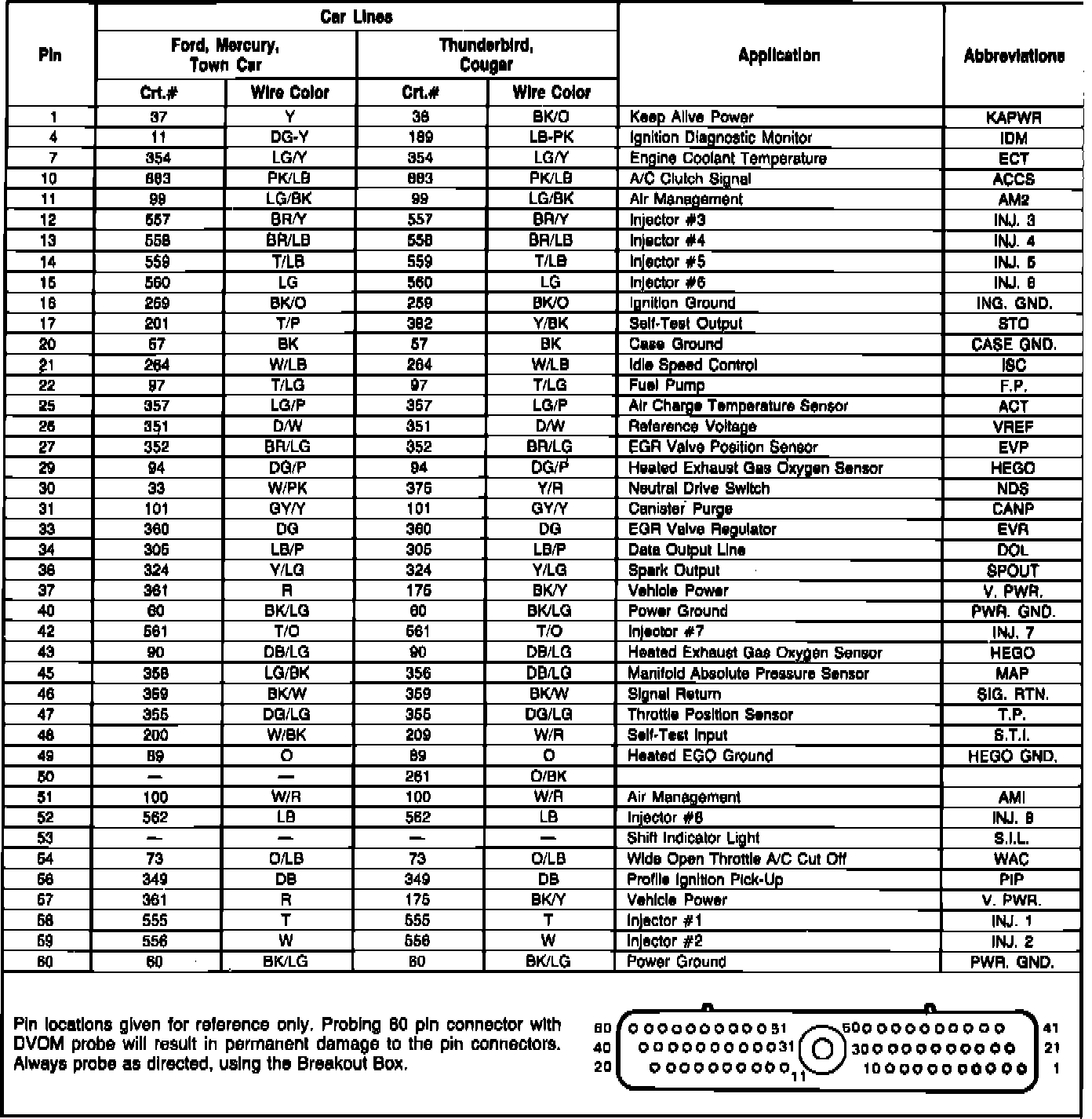 Fig. 238 EEC-IV module connector pin usage. 1986 Exc. Capri, Continental, Mark VII & Mustang W/V8-302 SEFI engine: