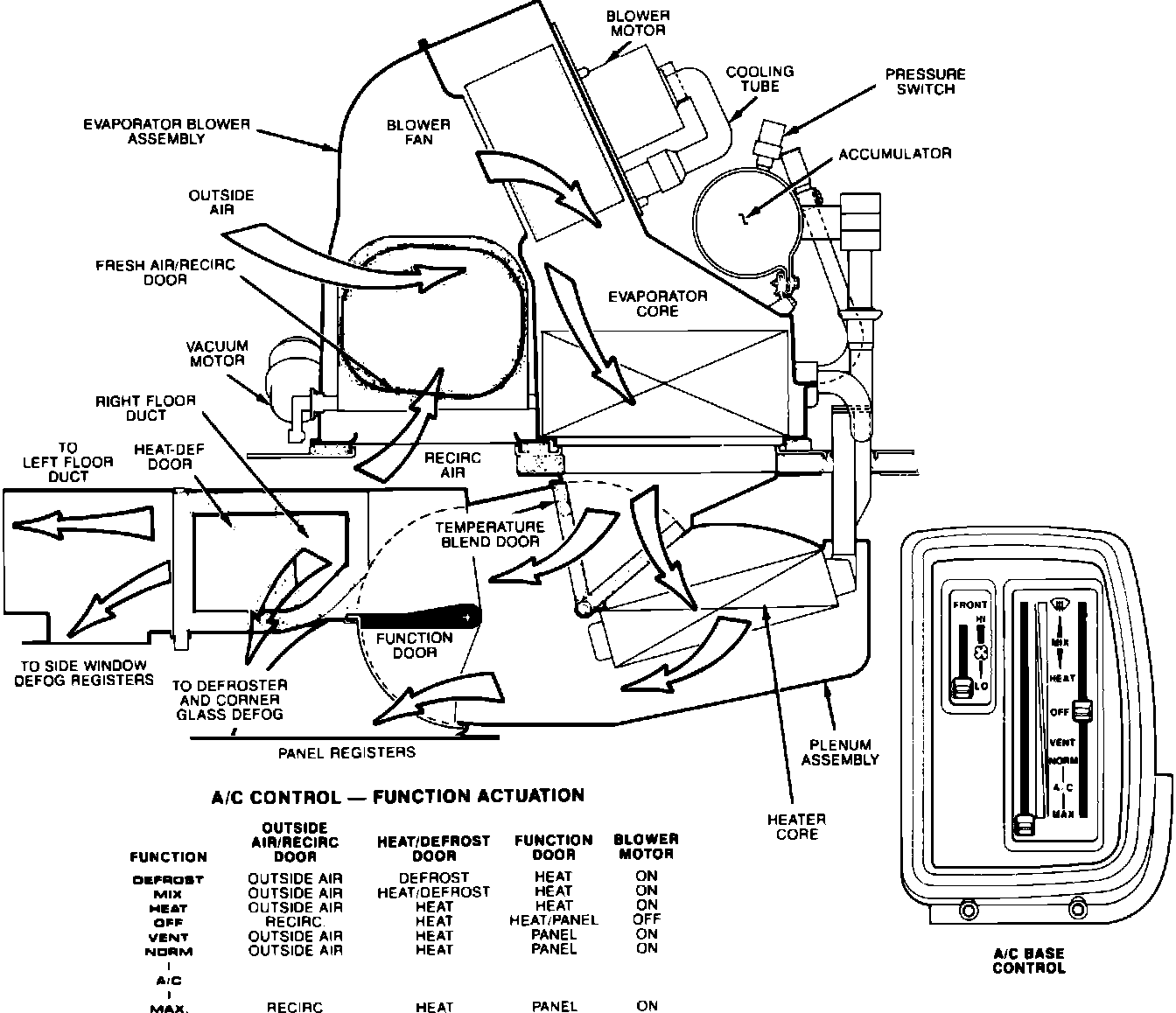 If momentary hiss can be heard when the function selector lever is moved from one position to another, vacuum is available at the control assembly. Cycle the selector lever through each position with blower on HI, while checking the location of discharged air. The air flow schematic and vacuum control chart, Fig. 30, indicates the vacuum motors that should be applied for each position of the selector lever along with an air flow diagram of the system.