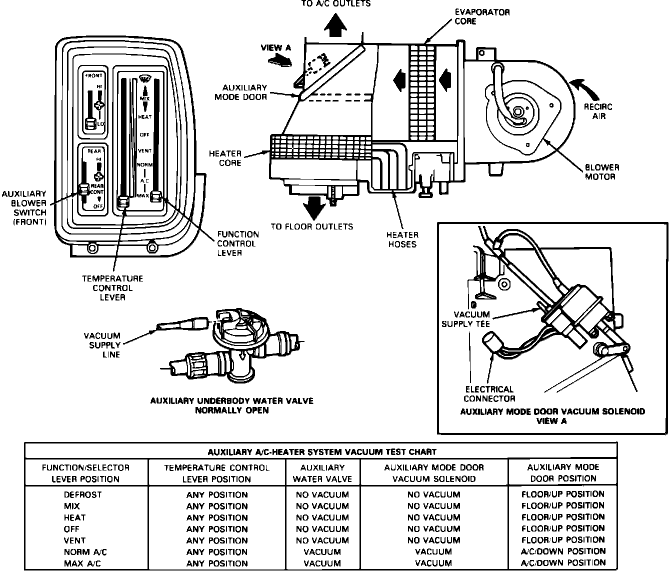 To test A/C heater control system, start engine and move function selector lever slowly from one position to another. A momentary hiss should be heard as the selector lever is moved from one position to another indicating that vacuum is available at the control assembly. A continuous hiss at the control assembly indicates a major leak somewhere in the system. It does not necessarily indicate that the leak is at the control assembly.