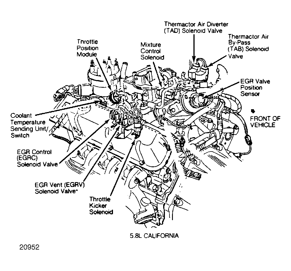 | Throttle Position Module (5.8L) | On left front side of carburetor. See Figure. |